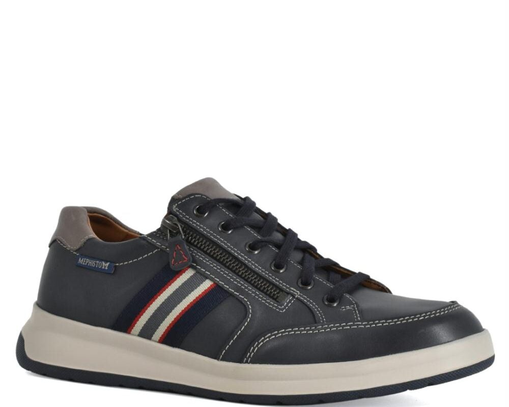 Mephisto maakt herkenbare herenschoenen. De uiterst comfortabele schoenen met een optimale pasvorm en de unieke Soft-Air Technologie, garanderen u aangenaam en moeiteloos loopplezier. Deze Mephisto sneaker Lisandro is een voorbeeld van ultiem comfort. De gewatteerde kraag en tong, de zachte leren voering en de lichtgewicht constructie houden uw voeten gelukkig tijdens uw dagelijkse activiteiten. Het geweldige voetbed geeft uw voeten de ondersteuning die ze nodig hebben. Bovendien is dit voetbed verwisselbaar zodat deze sneaker ook te dragen is met steunzolen. Het donkerblauwe leer in combinatie met de kleine rode accentjes geven deze sneaker een unieke uitstraling. Door de rits aan de buitenzijde is deze sneaker makkelijk aan- en uit te trekken.