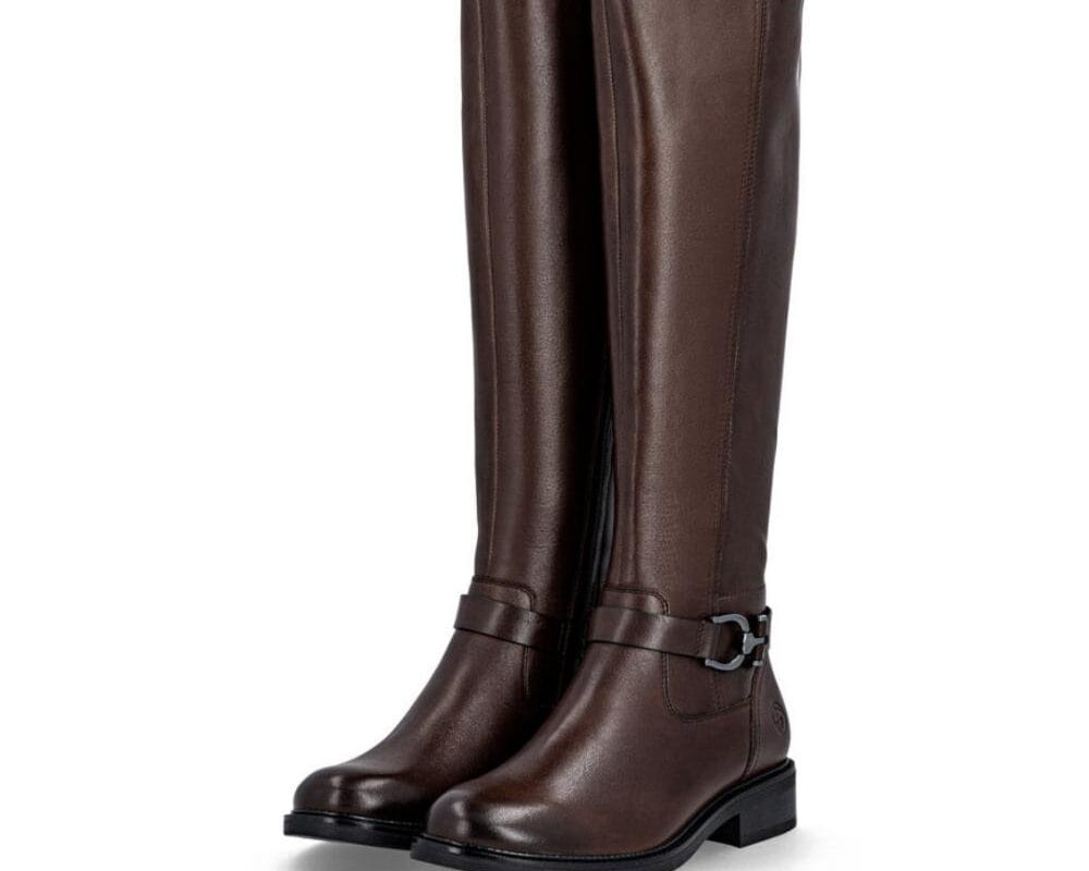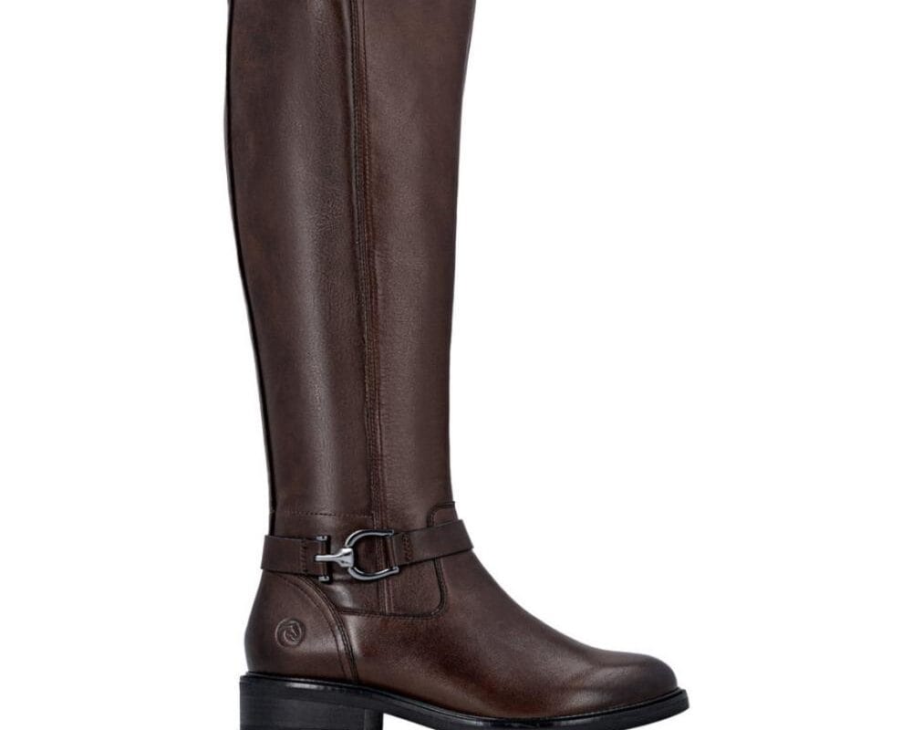 Deze donkerbruine lange laars van Remonte is een veelzijdige keuze voor de koudere dagen. Gemaakt van stevig materiaal met een stijlvolle gesp op de enkel en een rits aan de binnenzijde voor gemakkelijk aan- en uittrekken. De brede schacht zorgt voor extra ruimte rond het been. Het voetbed is uitneembaar, zodat je eventueel je eigen zooltjes kunt gebruiken. Een ideale laars voor dagelijks gebruik met een verfijnde uitstraling. Model D2W77-25.