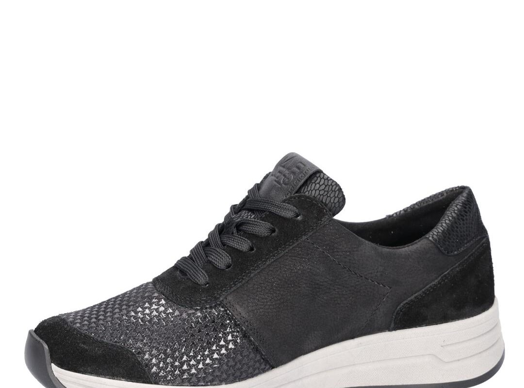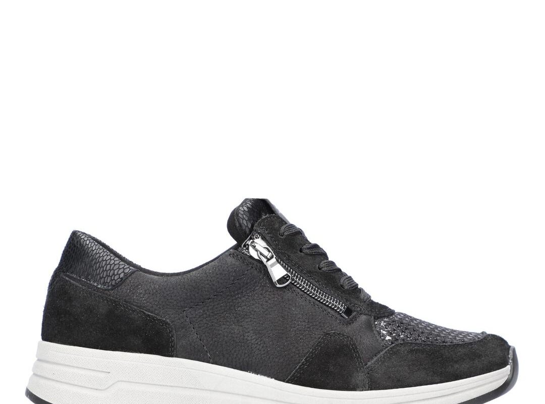 Sneaker zwart van Waldläufer, model 957H02 701 768. Deze schoen is ontworpen met stretchmateriaal aan de voorvoet zonder stiknaden, ideaal bij hallux valgus of hamertenen. De combinatie van suède en structuurleer zorgt voor een moderne uitstraling. Uitgevoerd met wijdte H, zijrits en een uitneembaar voetbed, geschikt voor uw eigen steunzolen.