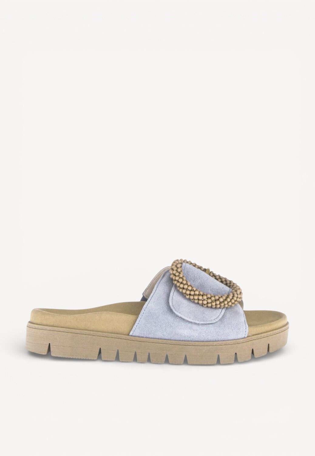 - Eén verstelbare klittenbandsluiting met een decoratieve kralenring voor een stijlvolle touch