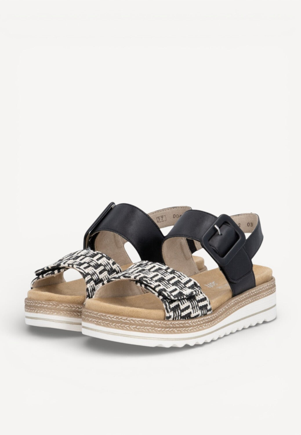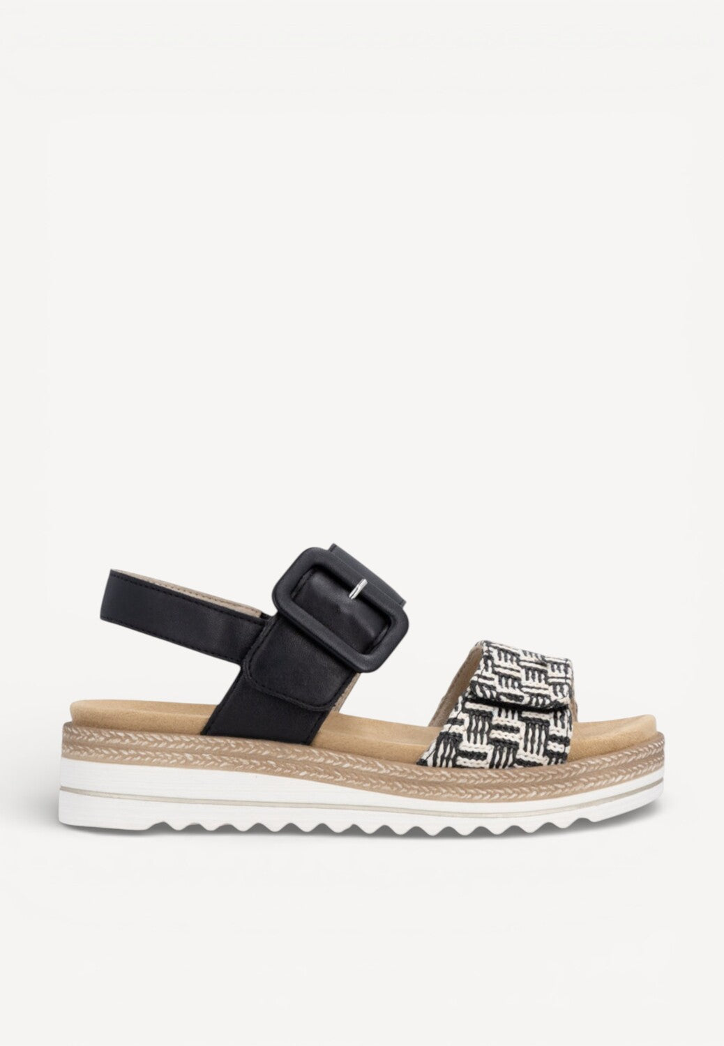 - De mix van zwart leer en het speelse zwart-witte patroon geeft de sandaal een moderne en stijlvolle uitstraling.