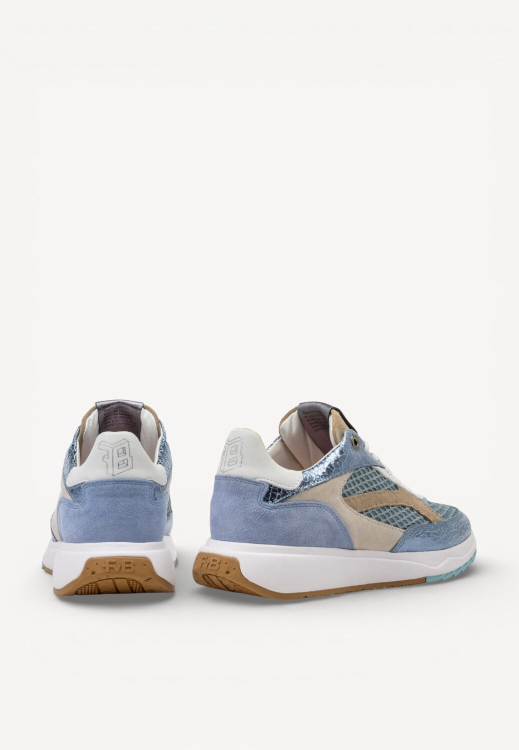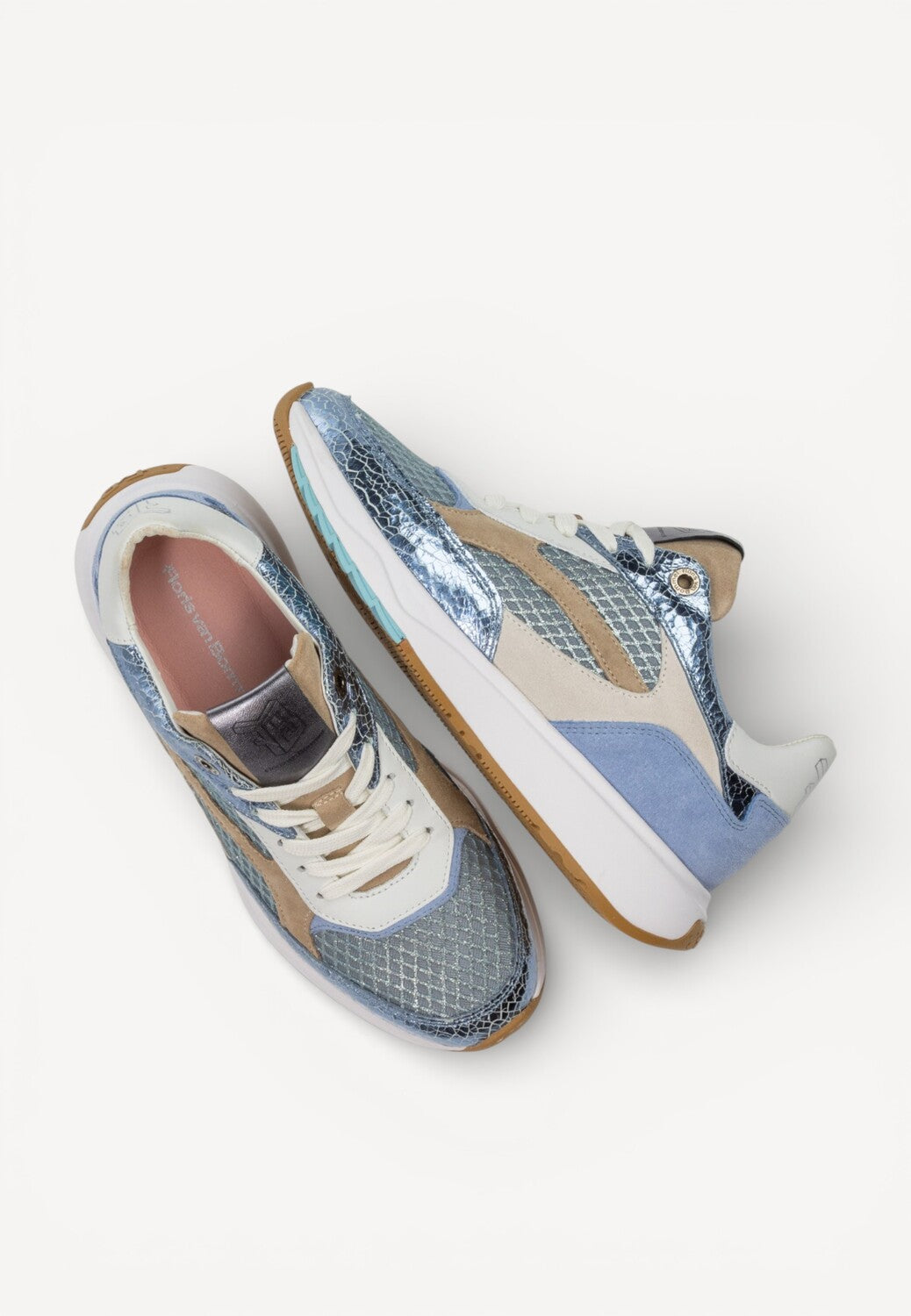 - De kleurenmix bestaat uit zachte blauwtinten, beige details en glanzende metallic elementen met een subtiel slangenreliëf. Dit geeft de sneaker een frisse, trendy uitstraling met een vleugje luxe.